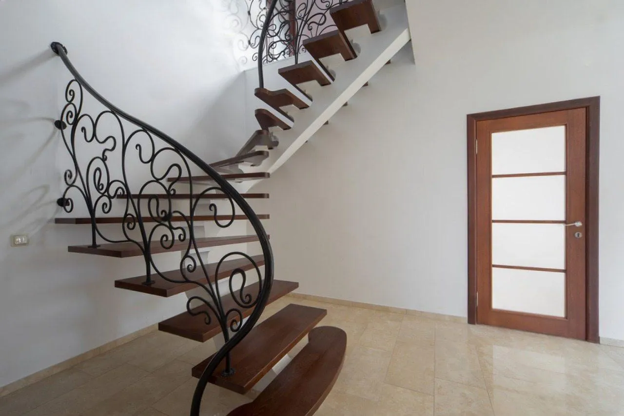 Основа композиции — белоснежный металлический монокосоур, который задает лестнице воздушный и динамичный силуэт. Мы изготовили для него ступени из цельного массива дуба, покрыв их прочным матовым лаком, который подчеркивает природную текстуру дерева. Особый шарм проекту придают лаконичные кованые перила черного цвета. Их изящные изогнутые линии, установленные в начале и конце марша, создают ощущение завершенности, не перегружая конструкцию.